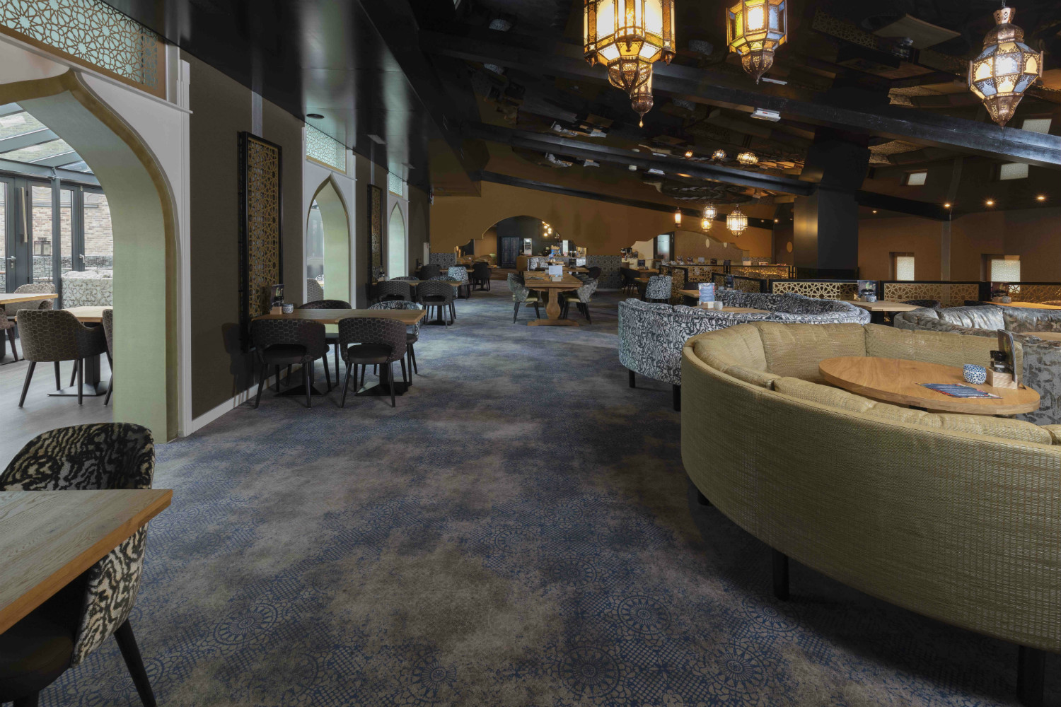 De grote rustruimte beneden met bar, restaurant, comfortabele stoelen, banken en aangrenzende lichte serre stralen een aangename sfeer en rust uit. Dat komt onder andere door het kleurgebruik, de lichtinval en de nieuwe inrichting. Zo worden de zintuigen bijvoorbeeld subtiel gestimuleerd met de unieke kleuren die je vindt rondom de Middellandse zee en elementen uit de Oosterse cultuur zoals fraai tegelwerk en aparte lampen.
