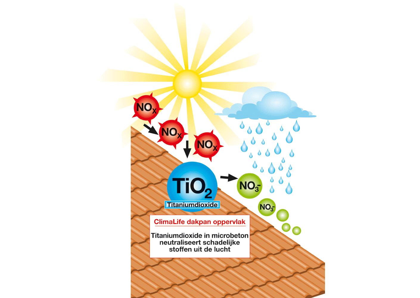 De ClimaLife betondakpannen bevatten een toplaag die op een unieke wijze wordt aangebracht met titaniumdioxide (TiO2) in de micromortel én in de coating. De oppervlaktelaag van de pan met titaniumdioxide wordt fotokatalytisch door het UV-licht. De vuile lucht die het oppervlak van de betondakpan benadert wordt daardoor gereinigd, terwijl de vuildeeltjes die op de pan achterblijven eenvoudig door de regen weggespoeld worden (het ‘selfwashing’ effect) en geen schade meer toebrengen aan het milieu. Bijkomend voordeel is dat het actieve oppervlak veel schoner blijft.