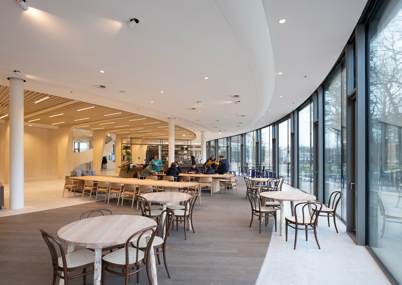 Vides creëren visuele verbindingen tussen de verschillende verdiepingen en de spiltrappen in deze vides vormen korte doorsteken, waardoor werknemers van de bank sneller worden uitgenodigd om de trap te nemen naar de verdiepingen. “Zowel de vormgeving als het materiaal- en kleurgebruik binnen het gebouw halen hun directe inspiratie uit de natuur”, zegt Erik Mulder van RAU. “Door de uitgebalanceerde kleurkeuze van de materialen vallen de houten constructie-onderdelen direct op.” De houten Cross Laminated Timbervloeren zijn deels gecamoufleerd door houten sporen en de daarboven gelegen plafondelementen. “Om transparantie van de werkvloeren en de relatie met het landschap zo helder mogelijk te krijgen, zijn transparante tussenwanden geplaatst bij speciale werkruimtes. In de ruimtes met meer visuele privacy zijn dichte wanden toegepast, die zijn voorzien van wanden met linnen afwerking waarin akoestische voorzieningen zijn opgenomen. De open, transparante begane grond heeft een betonnen vloer, vier meter hoge plafonds, houten wanden en houten spanten, met weinig geluidsabsorberende materialen. “Om de torens met elkaar te verbinden zijn we op zoek gegaan naar egaal en monolithisch materiaal met hoge geluidsabsorberende eigenschappen”, legt Mulder uit. “Voor het behoud van de monolithische uitstraling zijn de geluiddempende materialen in het plafond aangebracht, om te kunnen voldoen aan zeer hoge geluids- en gezondheidseisen voor de medewerkers van de bank. Dit zorgt voor rust en comfort in de ruimtes tussen de torens, die ook als werkruimte worden gebruikt”, zegt Mulder.