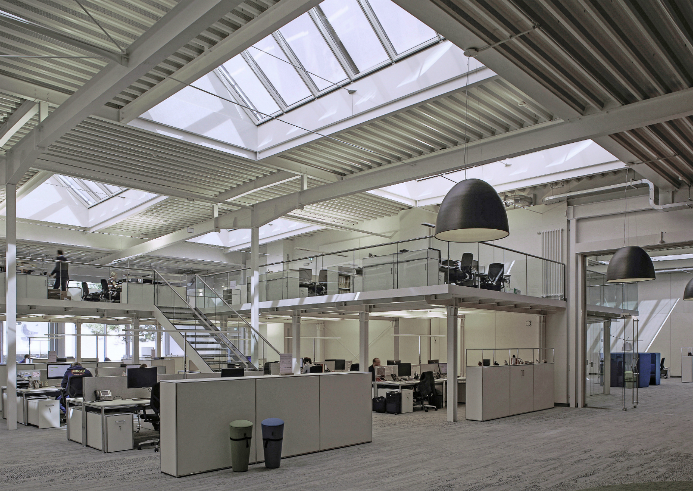 Onbeklede plafonds, ventilatiekanalen, stalen liggers en dragers karakteriseren het moderne totaalbeeld. Zo blijft de charme van het oude pakhuis behouden. Het hart van de innovatieve loft is echter het interieurconcept, met grootschaligheid, communicatie en creativiteit als uitgangspunt. Rohde heeft in totaal achttien lichtstraten in het dak van de hal ingebouwd. Om de lichtstraten te kunnen dragen moest de dakconstructie worden verstevigd. Door de extra I-profielen werd het hele lichtstratenoppervlak 65 cm opgetild, waardoor de galerijen op het tweede niveau van de hal een aangename hoogte krijgen en een loftachtige sfeer uitstralen. Glazen borstweringen en modulaire communicatiezones die dienstdoen als vergaderruimten kenmerken het transparante kantoorlandschap. Akoestische trapeziumplaten en vloerbedekking zorgen voor een zeer goede akoestiek.